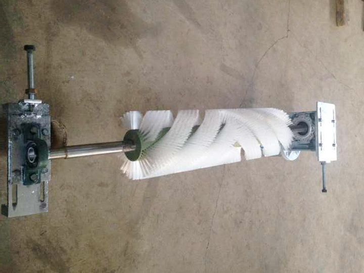 清掃器毛刷輥是由電機、蝸輪式減速機、聯軸器、刷輥、帶調心軸承的軸承座等構成,刷輥是由進口耐磨尼龍絲沿軸身呈螺旋形布置而成,電機與減速機為本體構成驅動裝置,通過聯軸器與刷輥的一端相連。刷輥的另一端通過帶調心軸承的軸承座支撐。